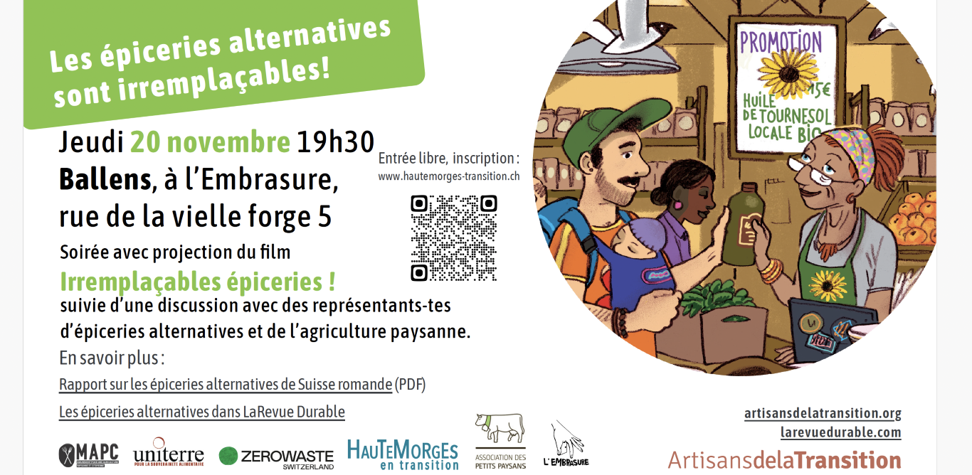 Réalisé par Jacques Mirenowicz, le film « Irremplaçables épiceries ! » (47 minutes) met en lumière le fonctionnement d’épiceries alternatives en Suisse romande. Ces commerces s’approvisionnent auprès de fermes en agroécologie et d’ateliers de transformation artisanaux. Ils garantissent la transparence sur leurs marges, évitent le gaspillage alimentaire, limitent les emballages, assurent un contact privilégié avec la clientèle et sont en… Lire la suite »Ciné-Club : projection du film «Irremplaçables épiceries!»